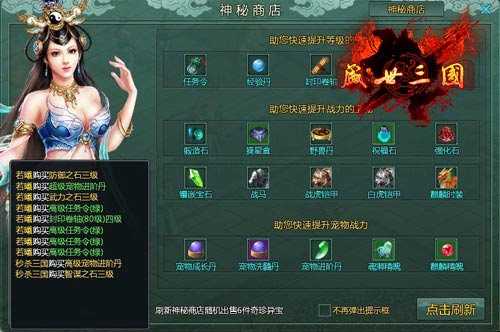 这里有各种各样的宝石、熊丹、经验丹、任务令、麒麟铠甲等等宝贝,你想得到吗?那就快来陪游《盛世三国》的神秘商店吧!当玩家光临神秘商店时,你可以根据神秘商店给你提供的宝贝页面看看是否有你想要买的宝贝,如果没有你可以点击刷新,系统就会从新换一些新宝贝供你选择。不过要提醒一下各位玩家,每刷新一下需要花费100两非绑定银子。