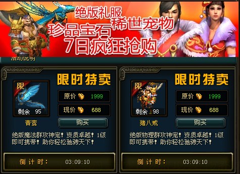 【活动内容】:新区开服后活动时间内,将会对部分橙色宠物特殊时装重要道具进行限量打折出售,轻松获得极品宝宝,还在等什么,机会不容错过!