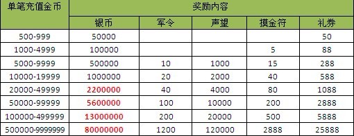 【活动内容】:活动时间内,单笔充值订单充值金额满足以下条件即可获得相应礼包一份,多次充值可以多次领取奖励!