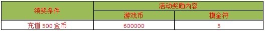 【活动内容】:活动时间内,每日充值满500金币即可领取丰富奖励一份。(每天领奖一次。)