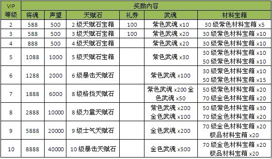 【活动内容】:活动时间内,VIP等级达到指定等级即可获得相应的VIP礼包奖励,礼包内含更多助您踏上强者的道具物品,不容错过!