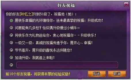 当玩家达到20级后,每次升级时,该玩家的好友都可以向该玩家发送祝福。
