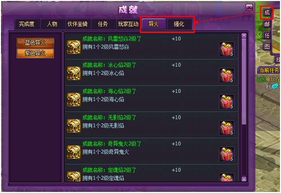 完成异火成就可以获得大量异火礼包,完成强化成就可以获得大量强化礼包