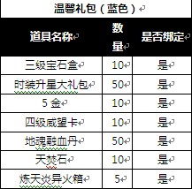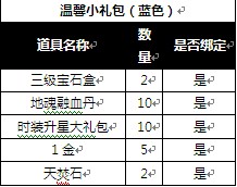 活动期间,每单笔充值3000-3999元宝能够获得【温馨礼包(蓝色)】*3