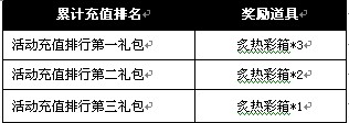 1、   活动期间内,只要您在活动期间累计充值50000元宝及以上,且在当前服务器充值玩家中充值排名前三的玩家即可获得大奖;