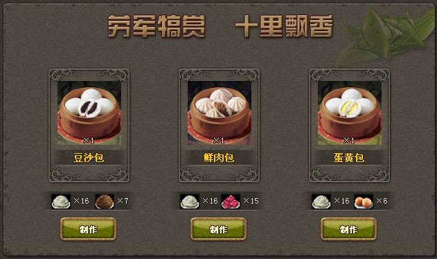 劳军犒赏,十里飘香!活动期间,所有玩家都可通过游戏凑齐材料制作包子,使用后可获得各类资源。