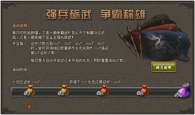 开宝箱:征收次数达到10次、20次、40次、60次、80次时,可领取大量银币礼包!