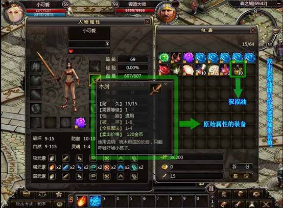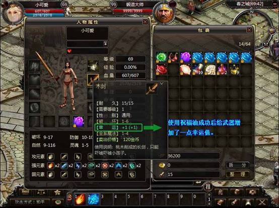 1. 祝福油:双击使用,可以给武器增加幸运值。