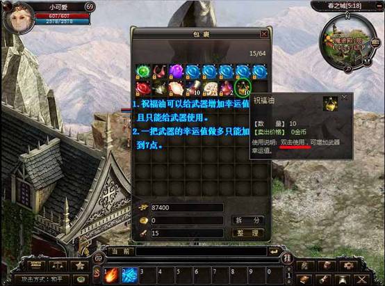 2. 祝福油只能给武器增加幸运。使用的时候角色必须装备一件武器,然后双击包裹中的祝福油即可。