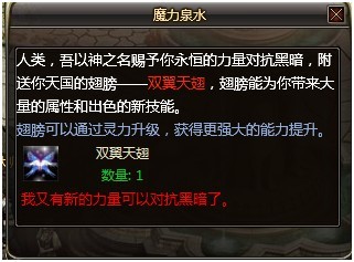 与魔力泉水NPC对话,投入五灵珠即可获得随机灵力值奖励,并且有一定几率获得翅膀技能书与信仰神水。投入的五灵珠的种类越多获得的灵力值越高,同时获得技能书与信仰神水的几率也越高。