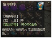 信仰神水可以在五灵珠提升灵力值时随机获得,同时也可以在商城中(售价98元宝)购买到