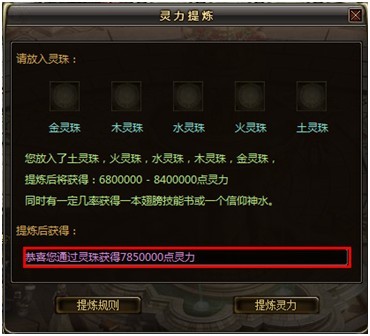 与魔力泉水NPC对话,投入五灵珠即可获得随机灵力值奖励,并且有一定几率获得翅膀技能书与信仰神水。投入的五灵珠的种类越多获得的灵力值越高,同时获得技能书与信仰神水的几率也越高。