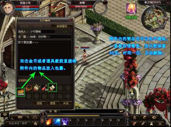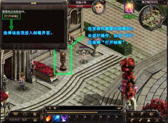1.收发邮件都是在邮箱NPC处进行的。在华景村的(106,29)和春之城的(37,46)分别有一个邮箱NPC。