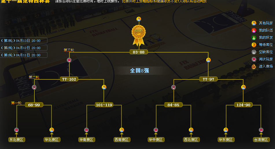 大赛总共分为8个区,每个区可以报名32个人,也就是256人,当报名满后,每个赛区排出赛程,也就是谁对阵谁的。等每个赛区决出最后一个玩家的时候,在8个区决出的球队进行对战直至最后一名出来。