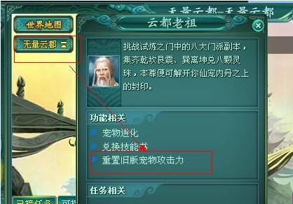 已经进化过的宠可免费到“无量云都-云都老祖”处进行重置攻击力,重置时只重置已经出战的宠,如身上有多个宠,可依次出战后重置,重置后可提高宠物攻击力(注:重置不影响宠物内丹,攻击将按一定比例提升。)