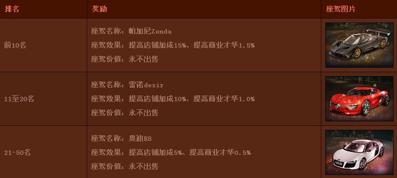 座驾效果:商业才华0.5%、店铺加成5%。