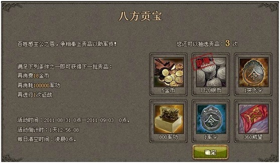 每消费一定量的金币、军功,或征战一定次数您就可以获得一批来自远方贡品。每获得一批贡品,您都能在六件中抽选其一,就会得到银币、金币、军令、军功、威望、突飞令中的一种,更有机率出加倍暴击。