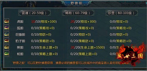 狩猎获得兽丹可点击直接使用永久增加人物属性,可在人物属性界面点击野兽丹按钮,查看角色服用野兽丹的数量以及增加人物属性的值。