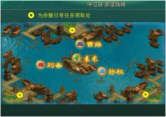 每日可在赤壁场景内完成草船借箭、火烧敌船、铁索连环、战前突袭4个日常任务,每完成一个任务可以获得一个随机宝箱;