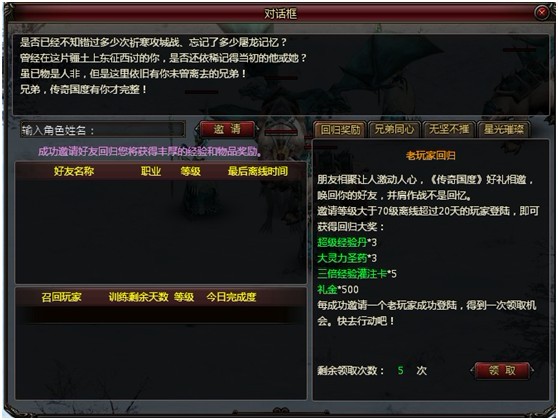 在这个面板可以对离线超过20天等级大于70好友进行发起邀请,当对方验证后,可以领取大量超值道具,邀请越多领取次数越多