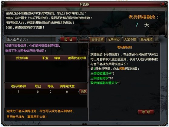 3按照7日回归活动任务完成程度给予邀请人唤回奖励,参与老兵训练任务,召回人也可以收到额外收益。