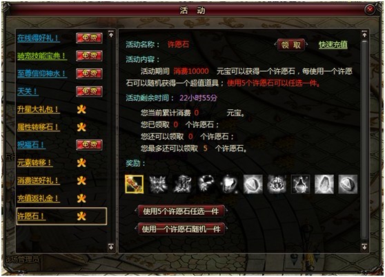 本次活动新增许愿石,充值即可获得。使用许愿石可以兑换顶级的武器、装备等。