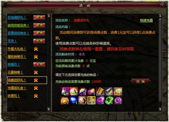 本次“消费送好礼”活动,新增“至尊幸运药水”,使用后可以将武器永久增加7的幸运,且效果不会掉。
